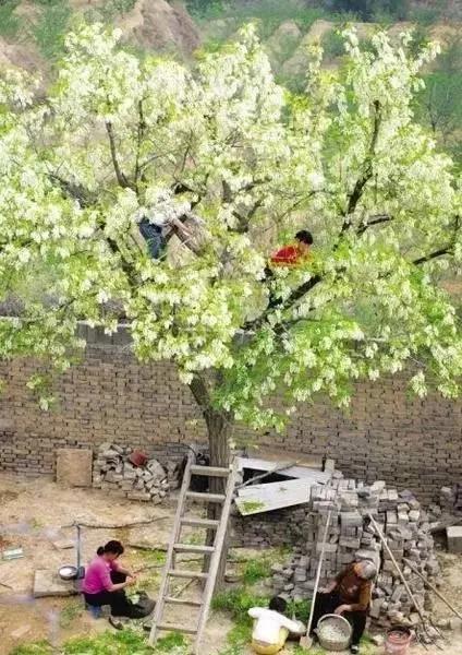 那时候,感觉槐花树是低微的树,就像那时候遍地的孩子都是散养的,自由生长,自由发挥,自由长高长壮。槐花树便是长在村口,长在门前,长在屋后,长在小河边,长在土堆上,长在无人问津的荒郊野外……总之无处不在地生长。靠自己顽强的性格和毅力生存下去,默默地经受着风吹日晒,霜打雨淋。待到春天里,便开满一树一树洁白成串儿一嘟噜一嘟噜槐花。那时候的乡亲们也不稀罕槐花,因到处可见,因随手可取。也因见多了,不足为奇槐花的美丽,觉得本就是这样的树就该开这样的花。像辛勤的农民,黄土地的身板,本该在黄土地上含辛茹苦地证实着自己的老实巴交。