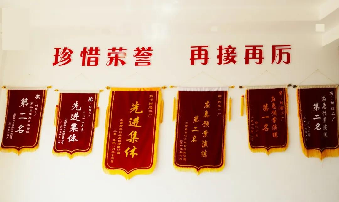 走进树脂二厂的办公楼,映入眼帘的是一尘不染的楼梯与干净的犹如镜子的地面,但是最最吸引你眼球的一定是两面墙上悬挂着的锦旗和钉在墙上的奖状。它们代表的是树脂二厂的骄傲与荣誉。