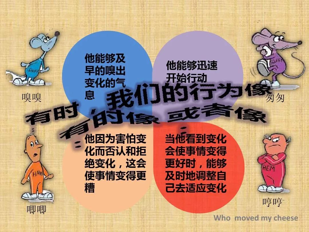 前两年也曾读过《谁动了我的奶酪》这本书,没什么印象,如今重拾,又处在这样的大环境,感触颇深,也许与经历、与人生、与年龄、与环境都有关系,而立之年,过于安逸,当生活突变时,我们危机感如此强烈,思前想后,顾东顾西,现在的我就像书中的“唧唧”,当改变来临,我们依然希望有天会回到原来的模样,畏首畏尾,不敢去开始新的征程,新的挑战。相比,两只小老鼠善于观察,思维敏锐,挂在脖子上的鞋子就是最好的准备,及时调整,迅速行动,没有思想包袱,轻松上阵,很快也就到达新的奶酪站。