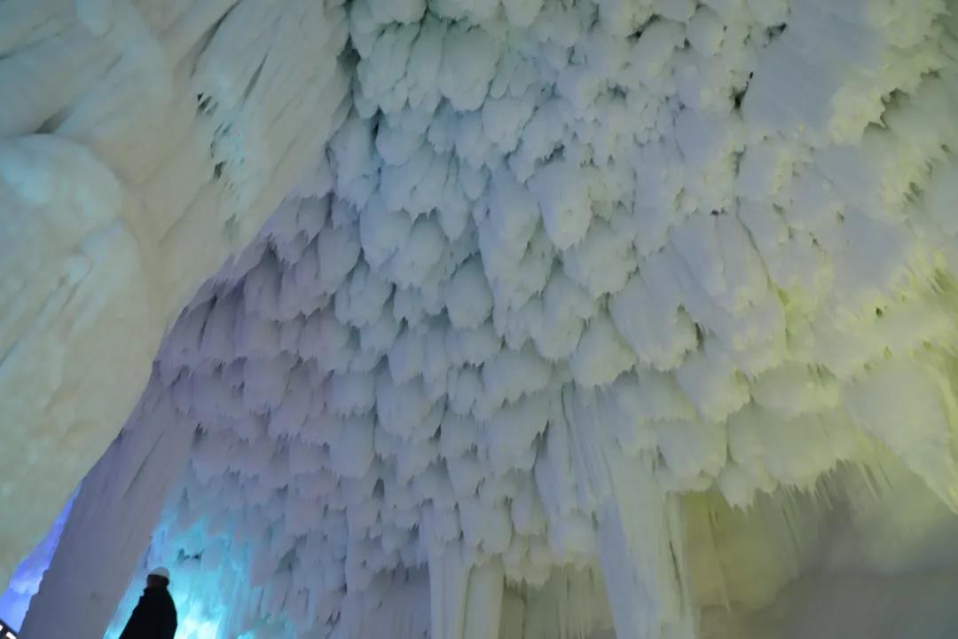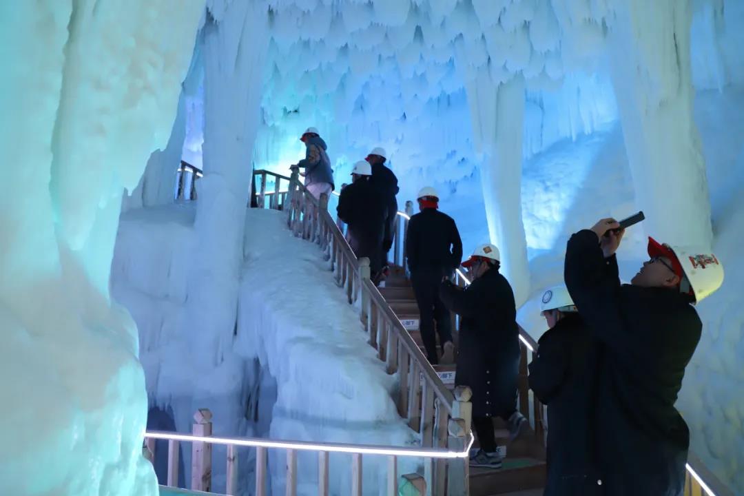过了桥,大家稍做休息,进入了万年冰洞群,洞内晶莹剔透,寒气逼人。据专家考证,云丘山冰洞形成于第四季冰川期,距今已有300多万年,它的规模在世界范围内都是极为罕见的自然景观。大家看着冰洞内诸多的冰笋、冰柱、冰锥、冰葡萄,不禁赞叹冰洞景色美轮美奂,犹如仙境。