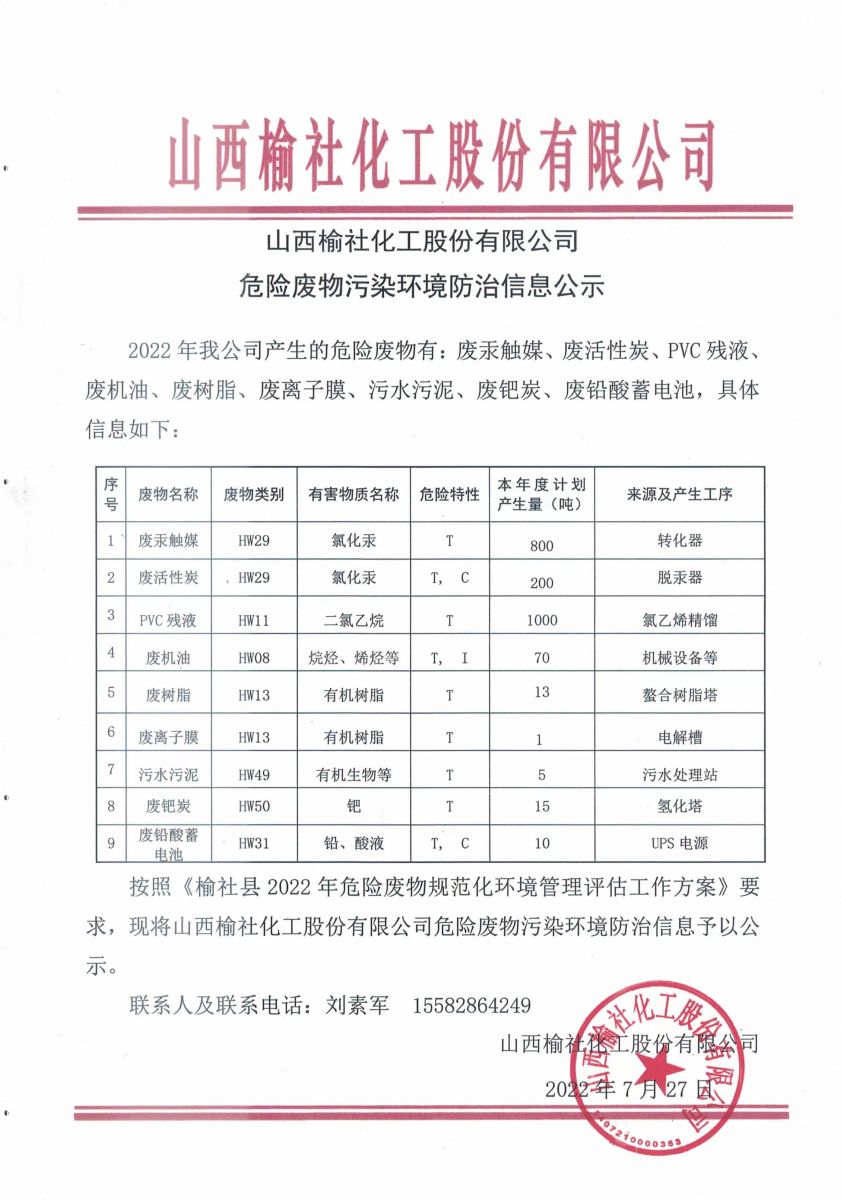 2022年我公司产生的危险废物有:废汞触媒、废活性炭、PVC残液、废机油、废树脂、废离子膜、污水污泥、废钯炭、废铅酸蓄电池,具体信息如下: