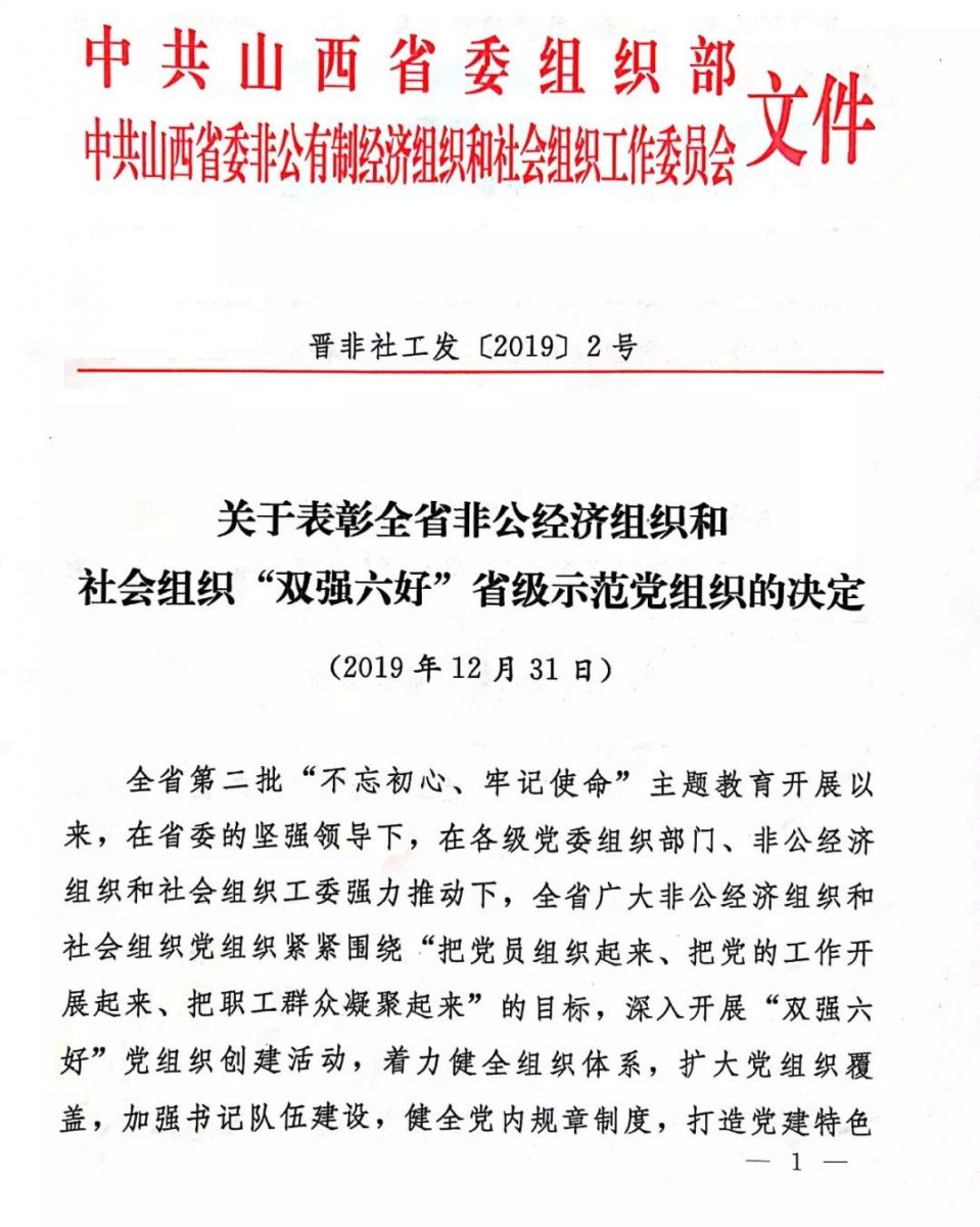 2019年12月31日,公司被省委组织部、省委非公和社会组织工委授予“双强六好”省级示范党组织荣誉称号。