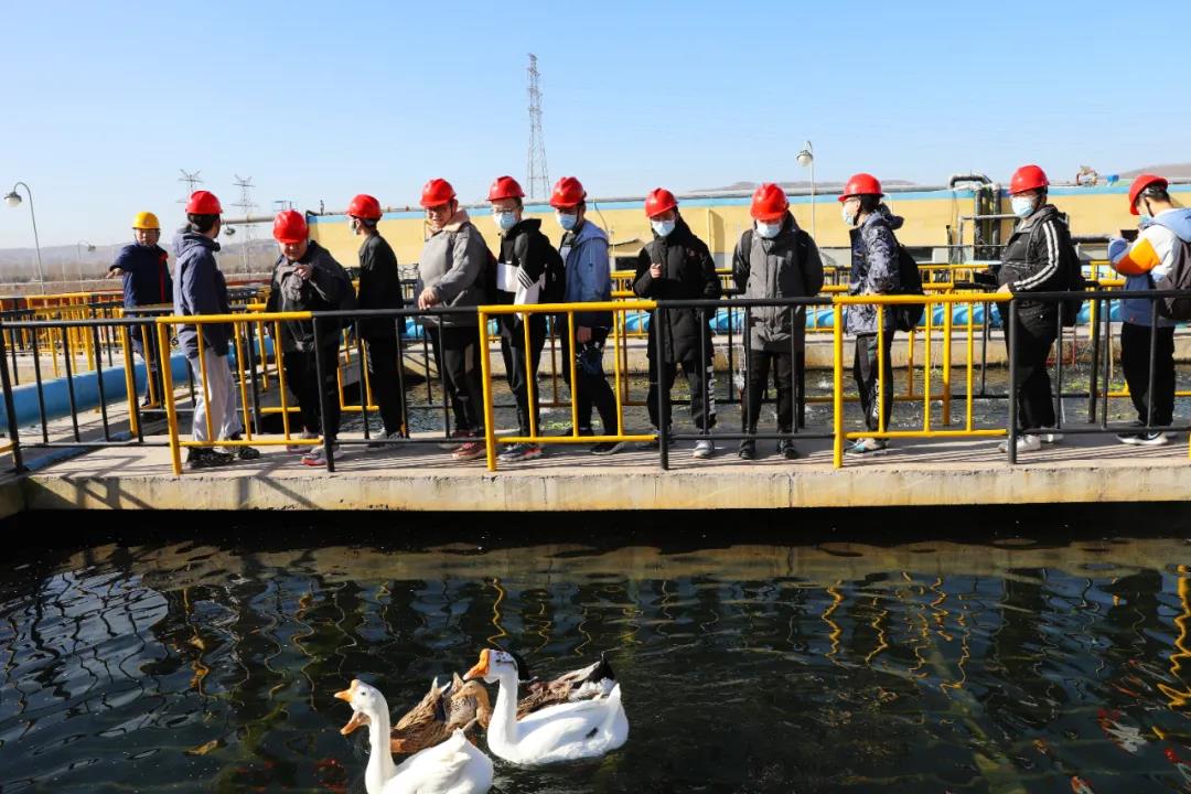 在污水处理车间,大家被污水池鱼游鸭戏的场景深深吸引,纷纷举起手机拍照留影。