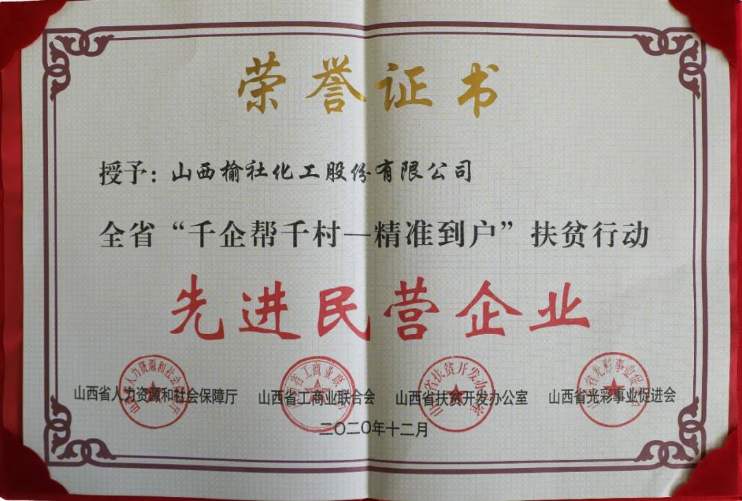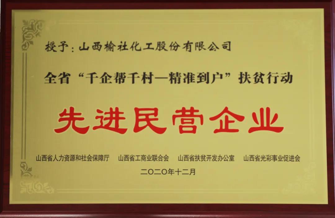 近日,在由山西省人力资源和社会保障厅、山西省工商业联合会、山西省扶贫开发办公室、山西省光彩事业促进会等四家单位联合举办的全省“千企帮千村——精准到户”扶贫行动先进民营企业表彰大会上,公司荣获“先进民营企业”荣誉称号。