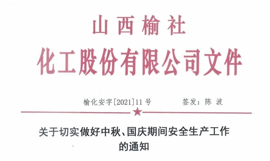 9月15日公司下发《关于切实做好中秋、国庆期间安全生产工作的通知》(榆化安字[2021]11号)文件,文件要求公司各单位要加强领导,落实责任;要组织节假日期间安全大检查,严格隐患排查“五落实”;各职能部门要强化危化品购销、运输管理及源头治理;要加强节日期间应急值守工作,确保信息畅通;加强劳动组织纪律、严防“三违”现象发生,做好清洁文明生产。