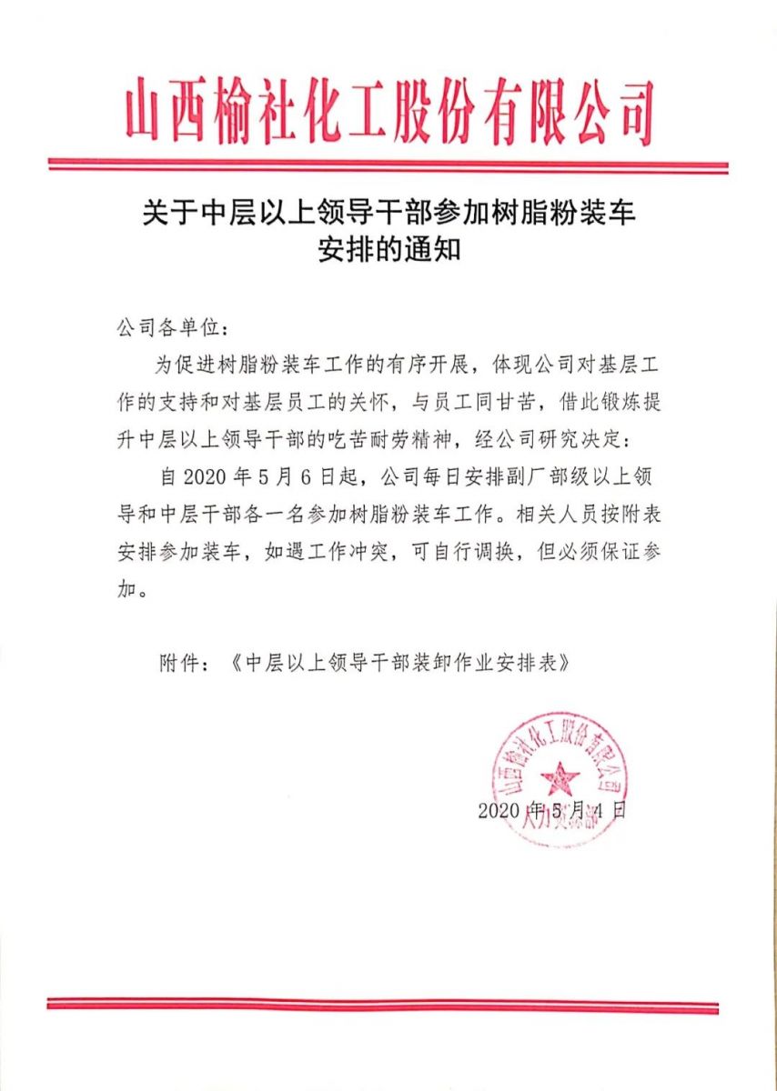 关于中层以上领导干部参加树脂粉装车安排的通知