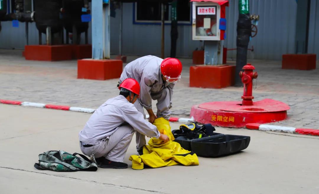 值班维修人员拿轻型防化服和空气呼吸器到达现场开始穿戴